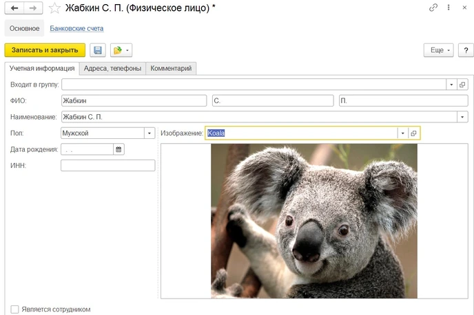 Поле формы "Фотография" отображает данные реквизита "Фотография" в двоичном виде.